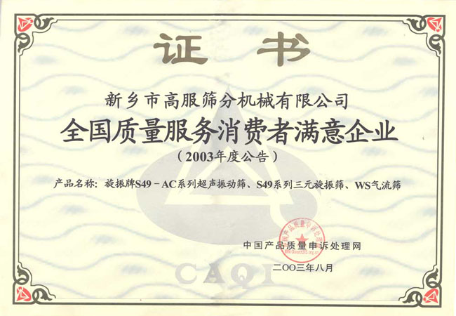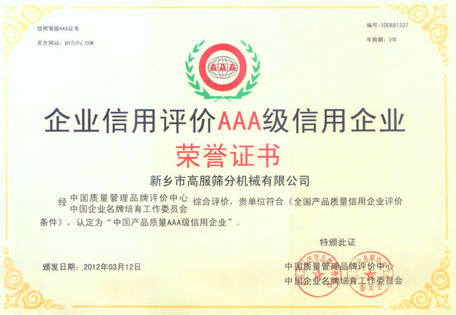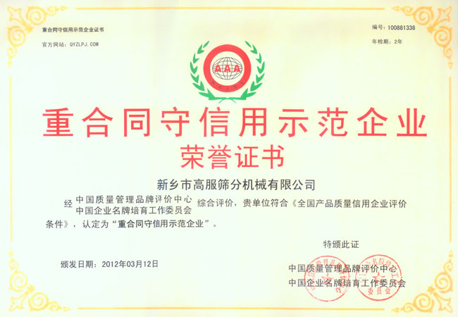 新鄉(xiāng)高服篩分機械有限公司榮譽證書